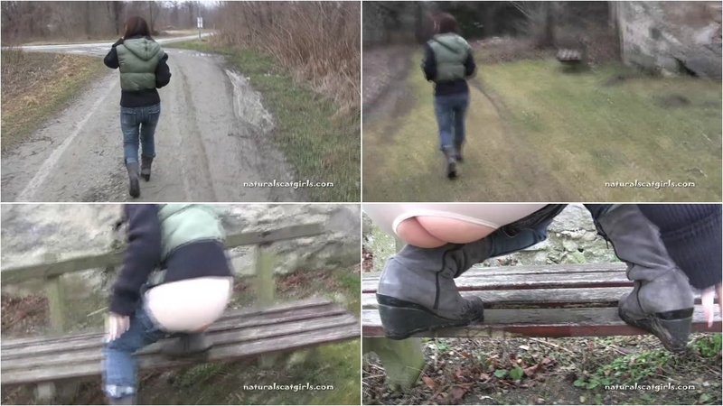 Girl in pantyhose and boots shitting and pissing outdoor. Closeup View